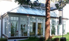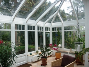 Wintergarten aus Meranti, mit Isolierglasfenster mit Sprossen und einer automatischen Belüftungsanlage.